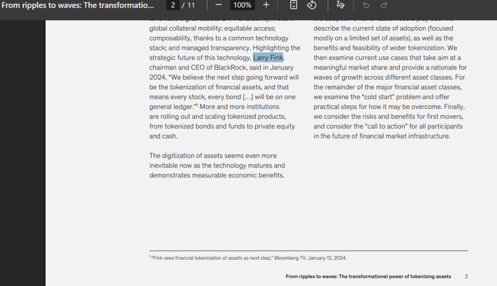 Volgens McKinsey heeft tokenization een kantelpunt bereikt. De eerste toepassingen draaien inmiddels biljoenen dollars per maand aan transacties op de blockchain. Larry Fink, CEO van BlackRock — ’s werelds grootste vermogensbeheerder — verwoordde het begin 2024 treffend:
